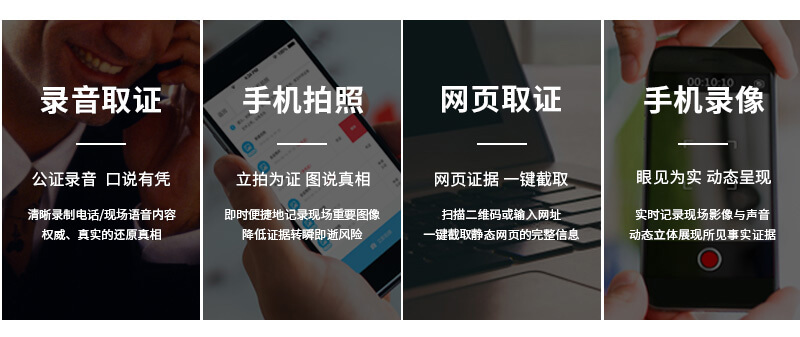 借助公证云App这一国内首个为公证处和社会用户量身定做的移动端在线公证平台,通过录音、拍照、录像、网页截图等方式自助实现对电子证据的取证和存证,并可结合公证在线申办功能,为电子证据“赋能”。